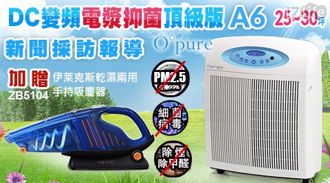 只要16,800元(含運)即可享有【Opure 臻淨】原價35,000元A6電漿殺菌DC節能空氣清淨機1台,購買再贈【Electrolux 伊萊克斯】乾濕兩用手持式吸塵器(ZB5104)1入,皆享1年保固!